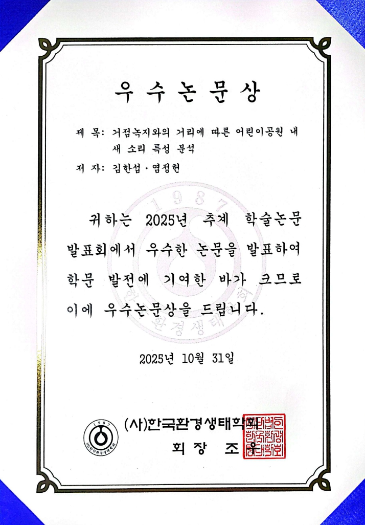 환경조경학과 김한섭 학생(석사과정)(지도교수 염정헌)이 지난 10월 31일 국립세종수목원에서 열린 (사)한국환경생태학회 추계 학술대회에서 우수논문상을 수상하였습니다.