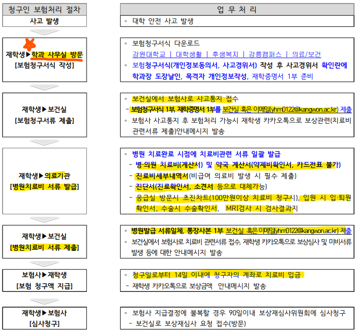 교내 활동(수업 등) 중 발생한 사고에 대한 실제치료비를 보상해 주는 교내외 치료비 청구방법에 대하여 안내하오니, 관련 안내가 필요하면 꼭 학과사무실(033-640-2526)로 문의바랍니다.