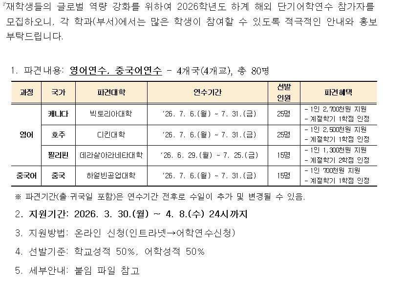 2026학년도 하계 해외 단기어학연수 참가자 선발 안내