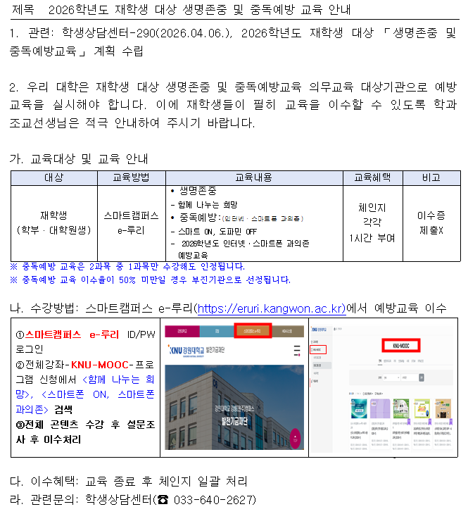 2026학년도 재학생 대상 생명존중 및 중독예방 교육 안내
