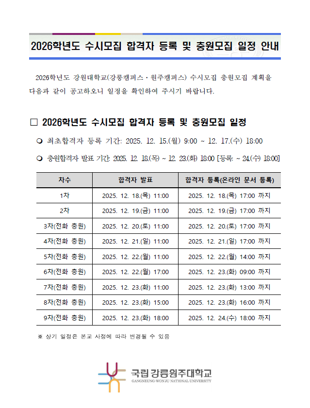 ※ 충원일정(전화충원 일정 포함)은 등록취소인원에 따라 변동이 발생할 수 있으니, 충원기간 중에는 대학에서 공지하는 내용을 반드시 숙지하여 주시기 바랍니다.