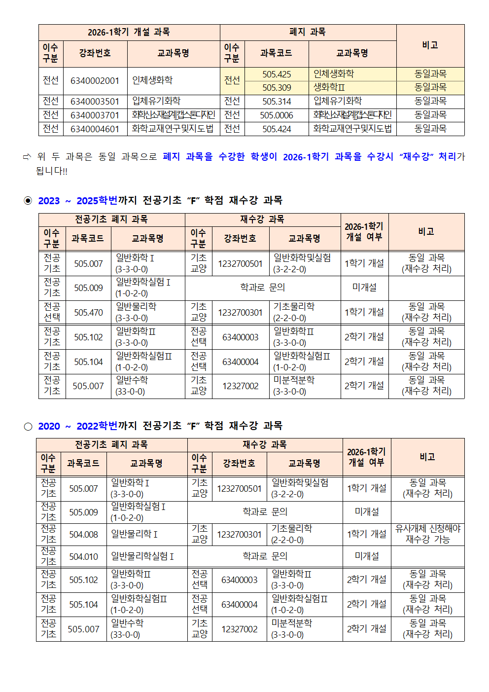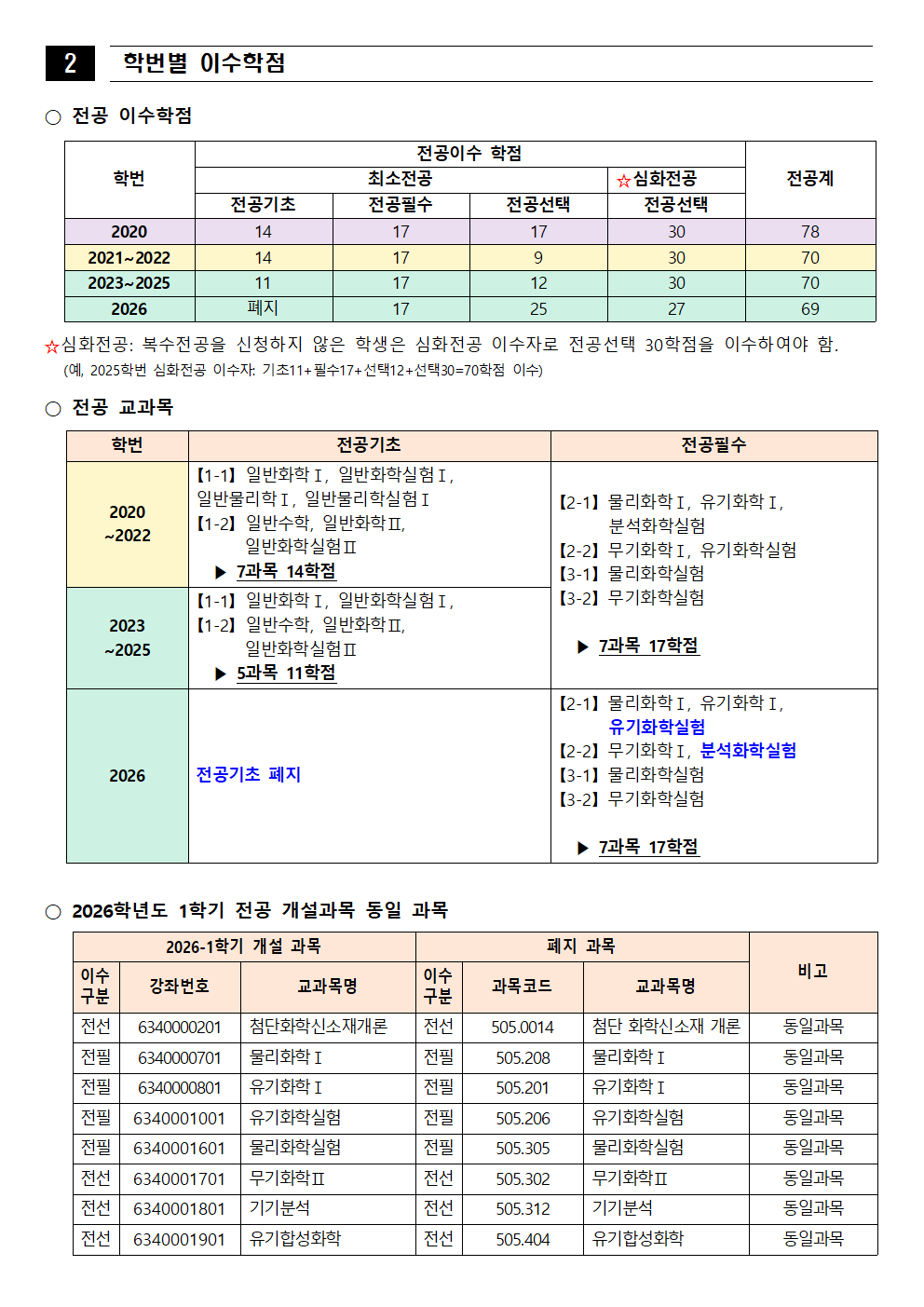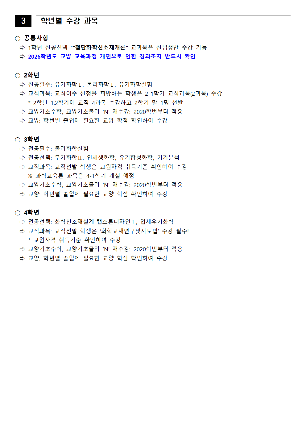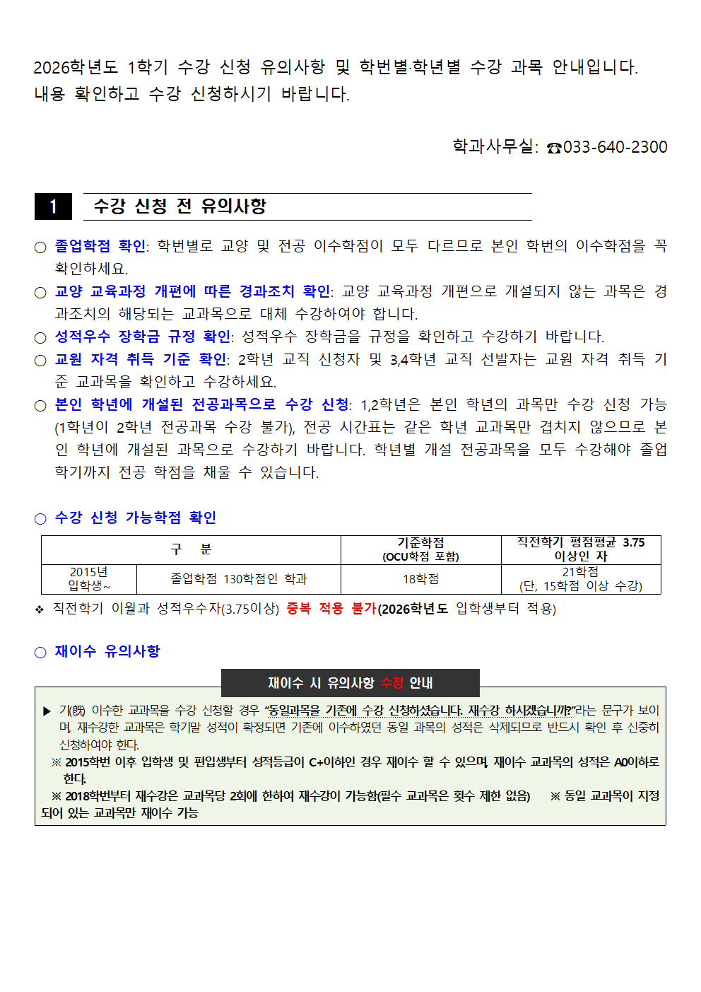 fnctId=bbs,fnctNo=562 [학부] 2026학년도 1학기 학년별 수강학신청 안내 작성일 2026.02.18 작성자 진미영 조회수 1317 첨부파일 1. (2020~2025학번) 교육과정 이수기준표.pdf 4. 장학금 규정(학과).pdf 3. (2019~2024학번) 강릉원주대학교 비교과 활동 졸업인증 운영 규정.hwp 0. 2026학년도 1학기 교육과정 수강편람(최종).pdf 2. (교직이수자) 교원자격 무시험검정 합격기준.pdf