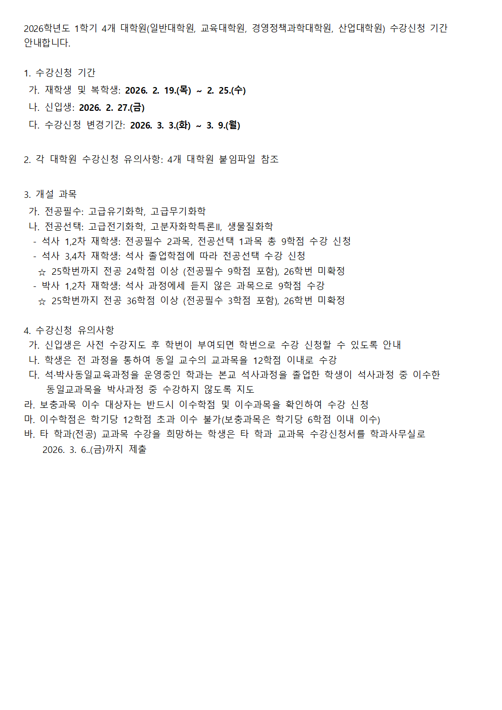 fnctId=bbs,fnctNo=562 [대학원] 2026학년도 1학기 일반대학원 수강신청 안내 작성일 2026.02.18 작성자 진미영 조회수 1202 첨부파일 4개 대학원 수강신청 유의사항 안내.hwp 타 학과 타 전공과목수강 신청서.hwp