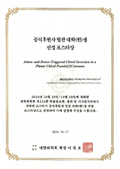 이번 학술발표회에서 박한결 석사과정생은 ‘음이온과 주개 원자에 의해 유도된 평면 키랄성을 가진 유사[1]카테네인의 카이랄 반전 (Anion- and Donor-Triggered Chiral Inversion in a Planar Chiral Pseudo[1]Catenane)’라는 주제로 발표했다. 해당 연구는 특정 금속이온이 음이온과 유사[1]카테네인 구조를 갖는 거대고리 주개 원자의 차이에 의해 평면 카이랄성을 제어하고 반전시키는 원리를 규명하였다. 이는 분자 센서, 스위치형 분자, 선택적 촉매 등으로의 응용 가능성이 높다.