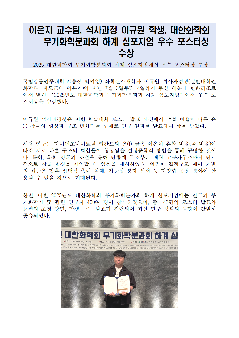 fnctId=bbs,fnctNo=990 이은지 교수팀, 석사과정 이규원 학생, 대한화학회 무기화학분과회 하계 심포지엄 우수 포스터상 수상 작성일 2025.07.08 작성자 진미영 조회수 2645 첨부파일 첨부파일이(가) 없습니다.