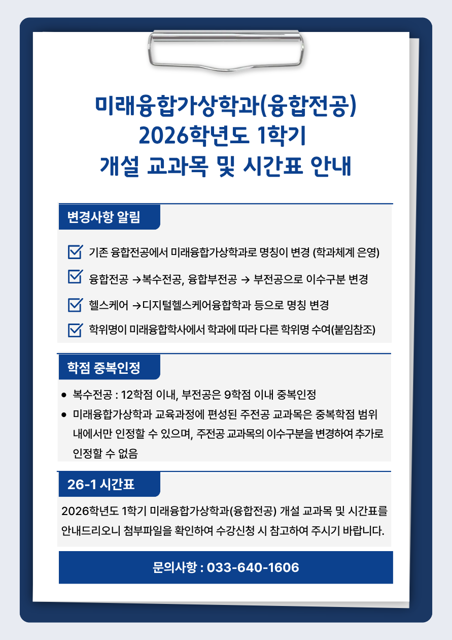 아래 첨부파일을(엑셀)을 확인하여 2026학년도 1학기 미래융합가상학과(융합전공) 수강 신청 시 참고하여 주시기 바랍니다.
