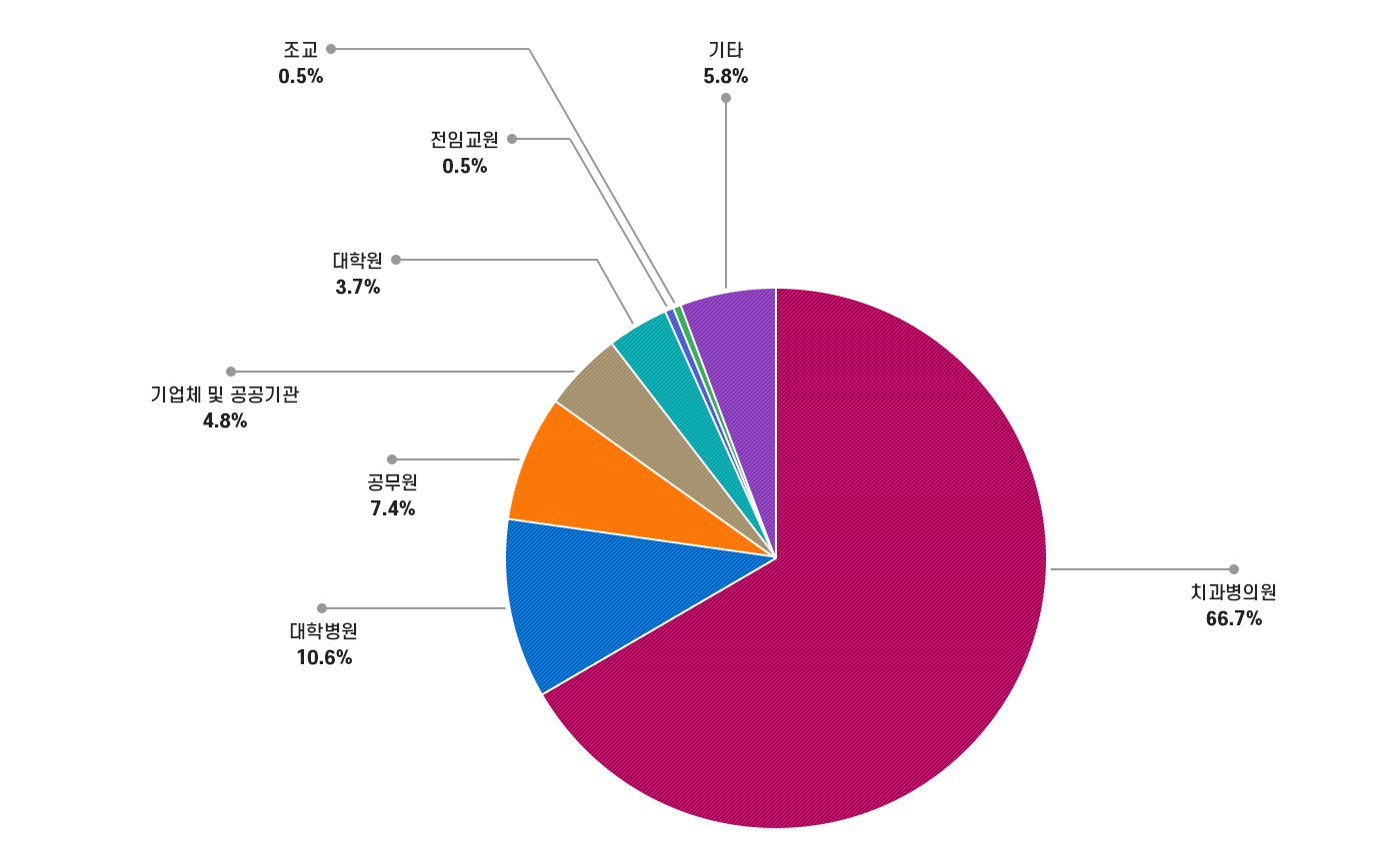이와 같은 역량기반의 교육과정을 거쳐, 4년 동안 기준학점을 이수하고, 국가고시를 통해 치과위생사 면허증을 취득한 후, 진출 할 수 있는 분야는 아래와 같습니다.