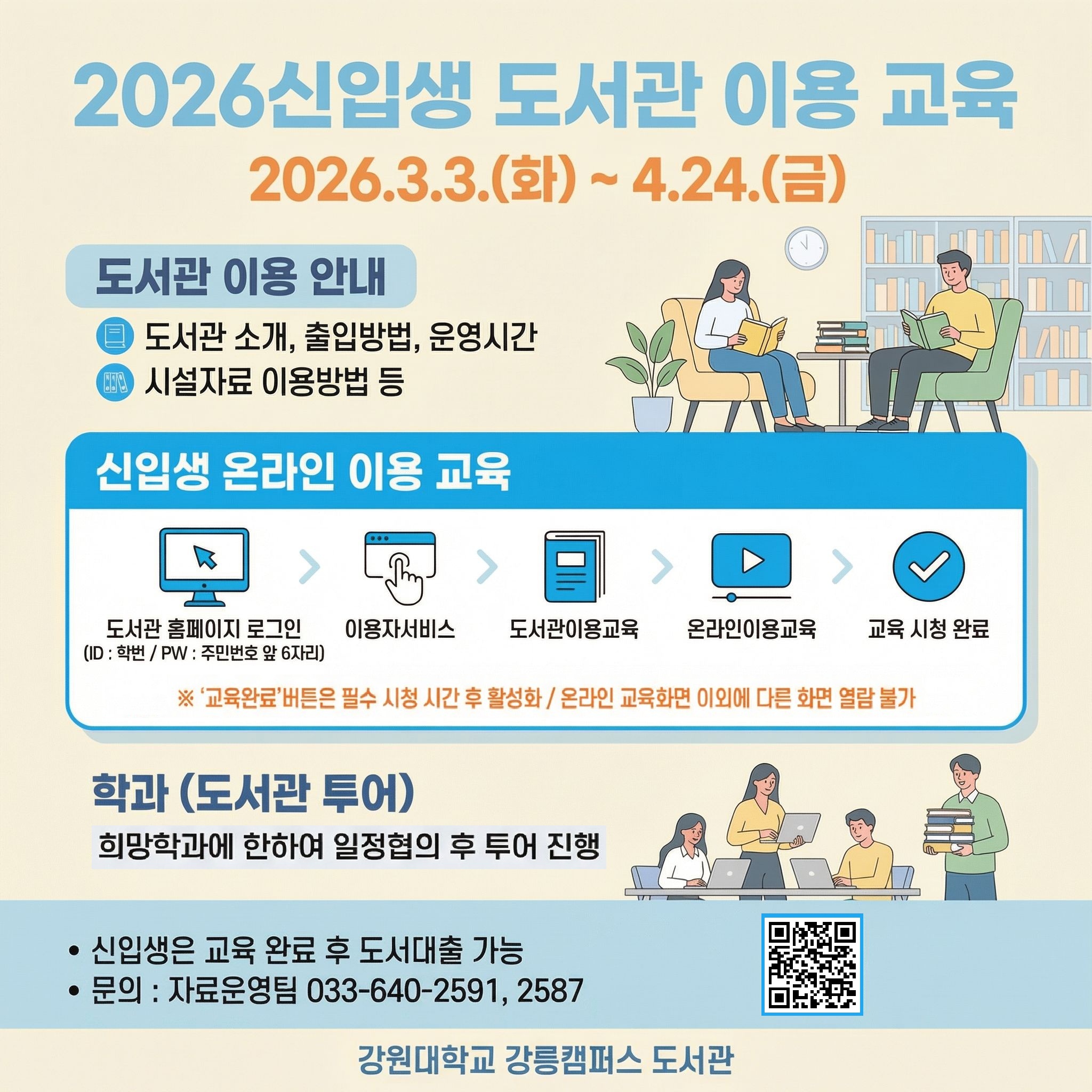 fnctId=bbs,fnctNo=811 2026년 신입생 도서관 이용교육 안내문 작성일 2026.03.03 작성자 김지미 조회수 943 첨부파일 첨부파일이(가) 없습니다. 다음글 이전글 2026학년도 신입생 입학식(OT) 및 신(편)입생 수강신청 안내 김지미 2026-02-24 17:00:39.0