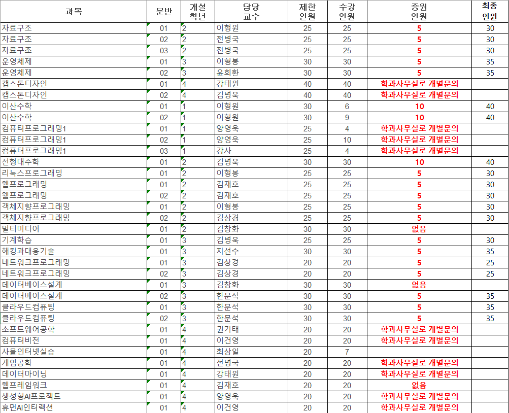 2026학년도 1학기 재학생 전공교과목 추가 증원 안내