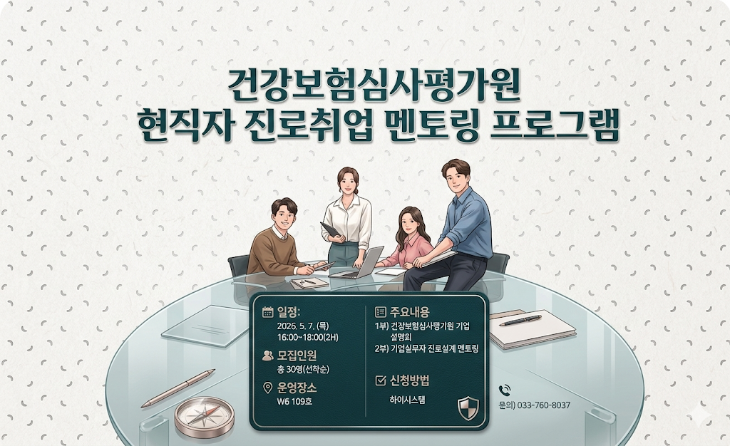 fnctId=bbs,fnctNo=881 '26년도 1학기 원주캠퍼스「건강보험심사평가원 현직자 진로·취업 멘토링 프로그램」프로그램 홍보 요청 작성일 2026.04.21 작성자 홍승연 조회수 10 첨부파일 첨부파일이(가) 없습니다.
