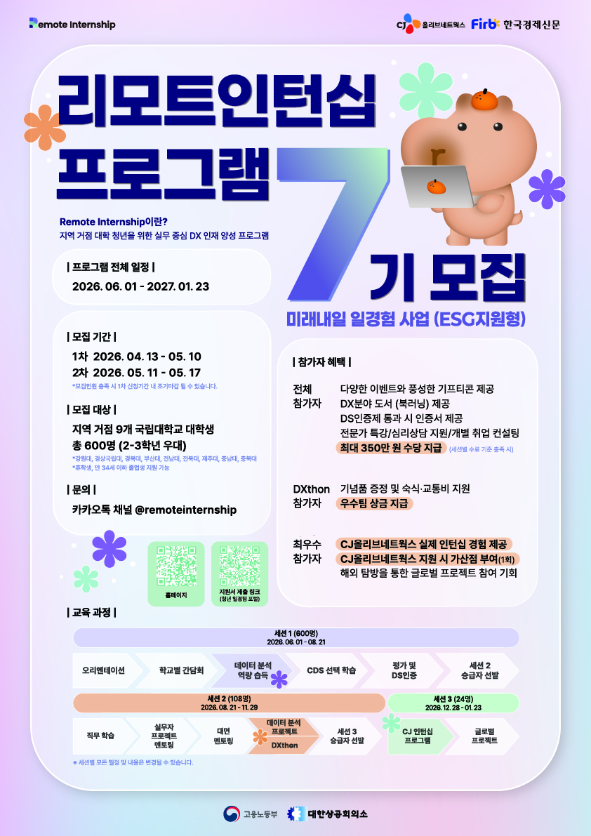 fnctId=bbs,fnctNo=881 미래내일 일경험 지원사업(ESG형) ‘Remote Internship’ 프로그램 신청 안내 작성일 2026.04.21 작성자 홍승연 조회수 6 첨부파일 첨부파일이(가) 없습니다.