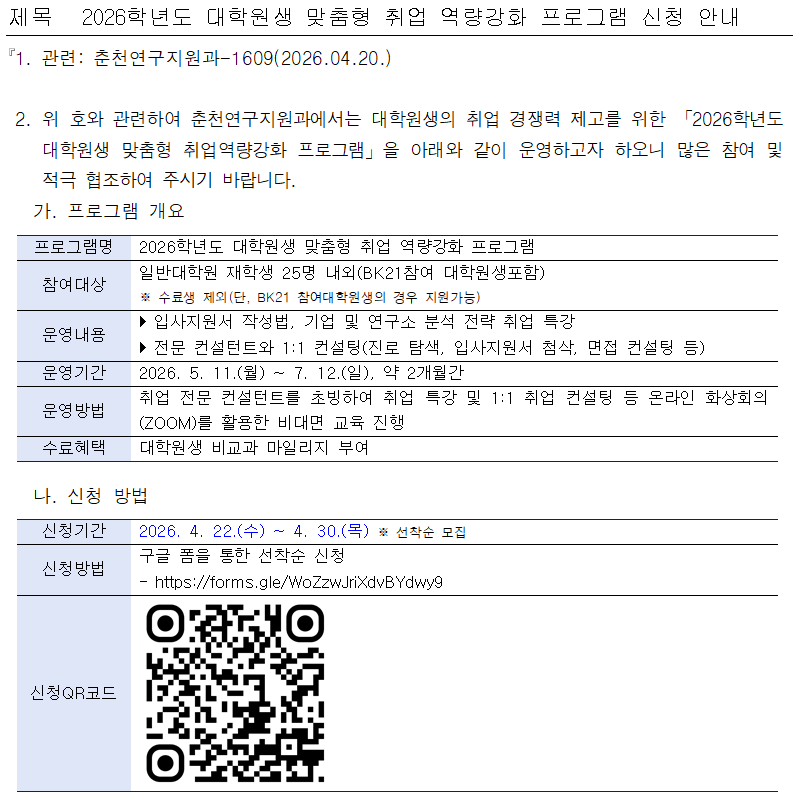 fnctId=bbs,fnctNo=881 2026학년도 대학원생 맞춤형 취업 역량강화 프로그램 신청 안내 작성일 2026.04.21 작성자 홍승연 조회수 5 첨부파일 첨부파일이(가) 없습니다.
