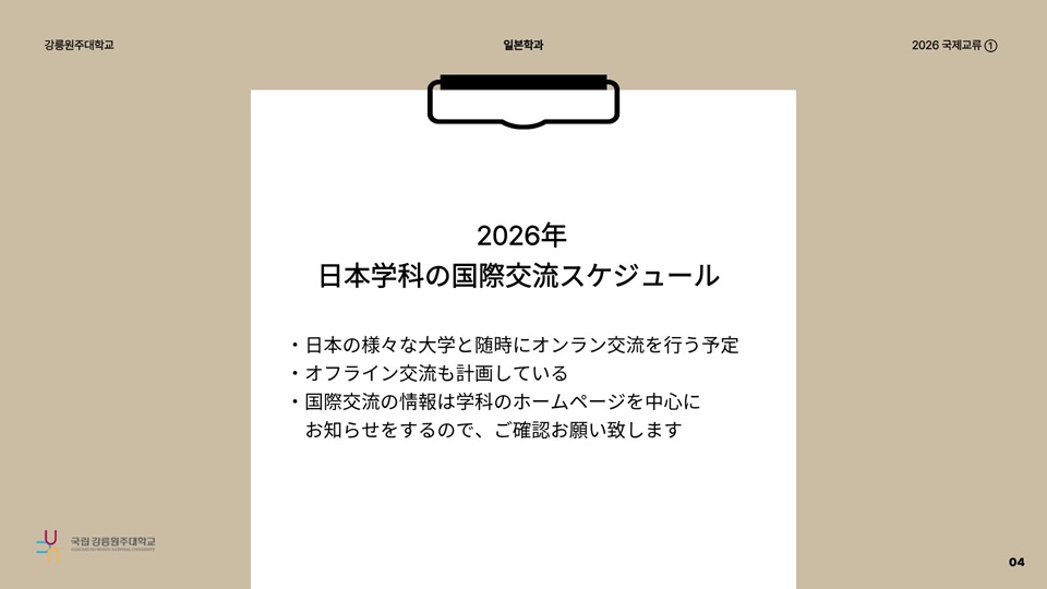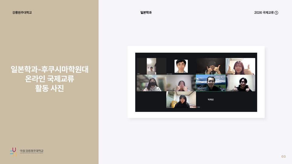 fnctId=bbs,fnctNo=736 [국제교류] 2026 후쿠시마학원대학 온라인 국제교류 보고서 글번호 328196 작성일 2026.03.06 작성자 엄태봉 조회수 960 첨부파일 첨부파일이(가) 없습니다.