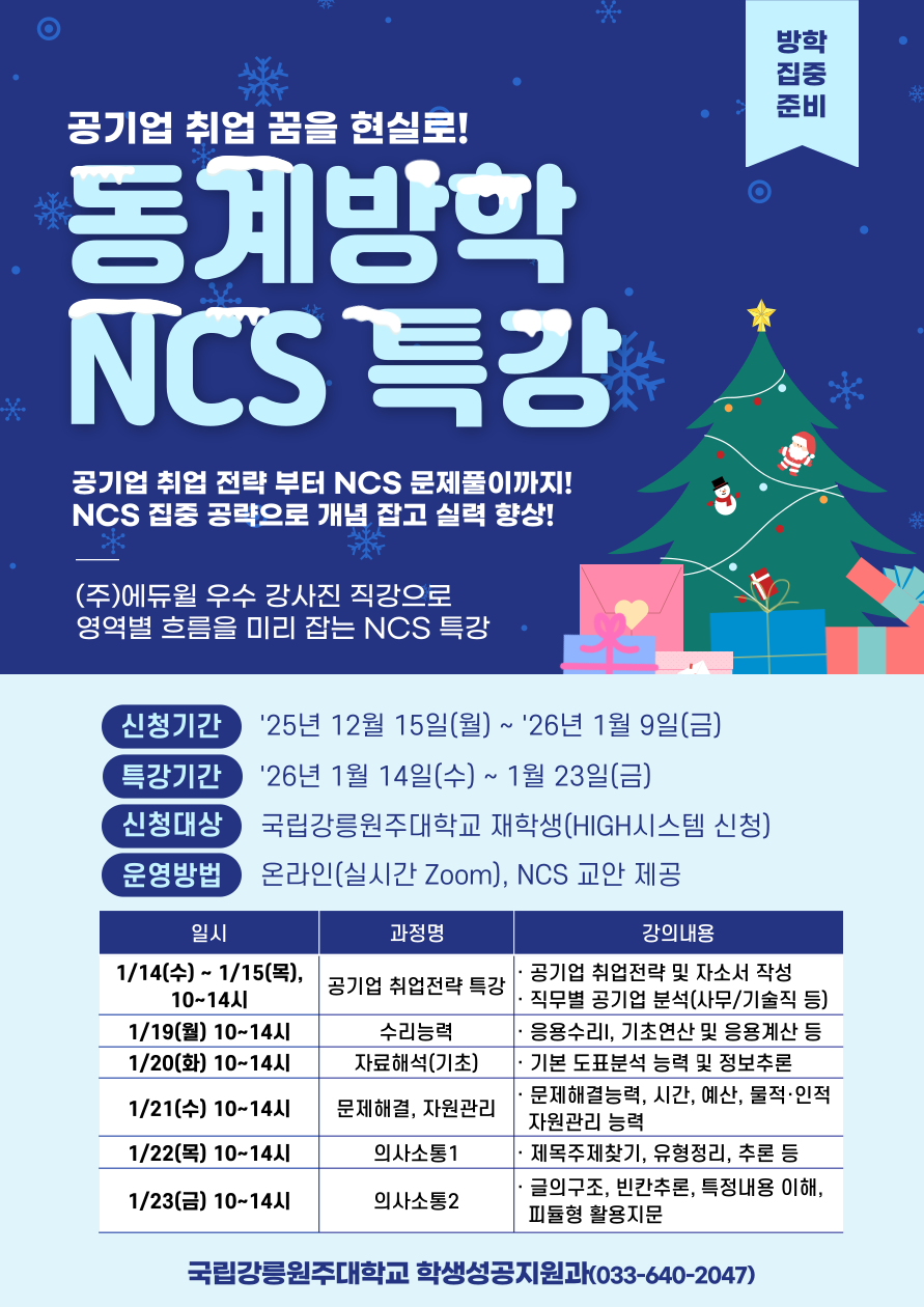 fnctId=bbs,fnctNo=871 [학생성공지원과] 동계방학 공기업 NCS 직업기초능력 향상 프로그램 작성일 2025.12.15 작성자 최지은 조회수 1248 첨부파일 첨부파일이(가) 없습니다.
