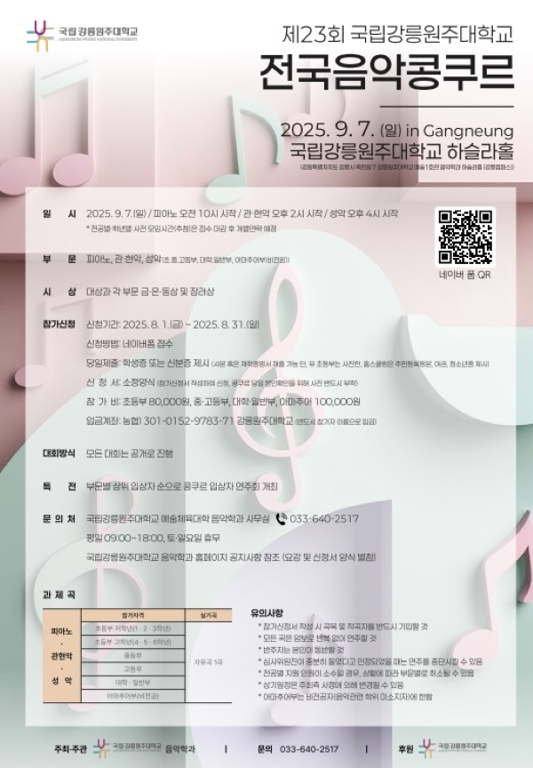 제23회 국립강릉원주대학교 전국음악콩쿠르 개최 안내