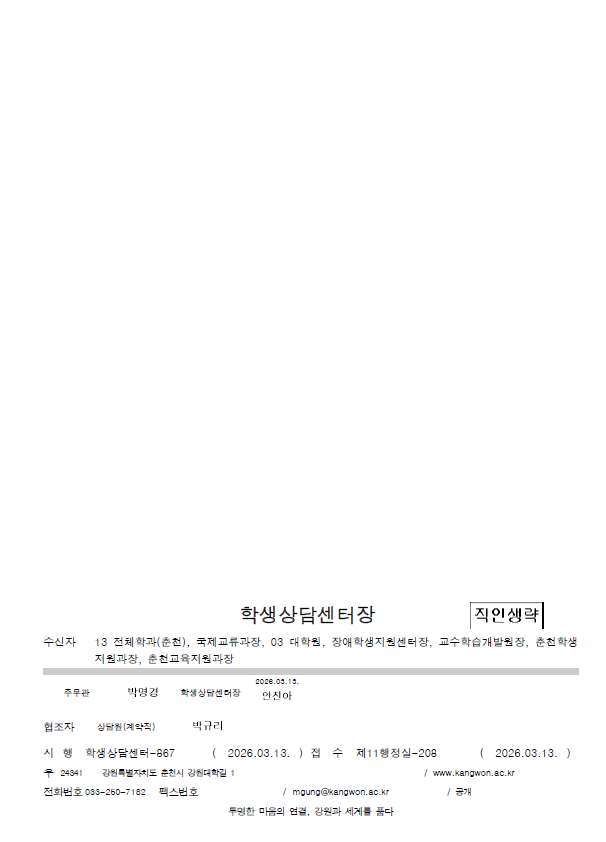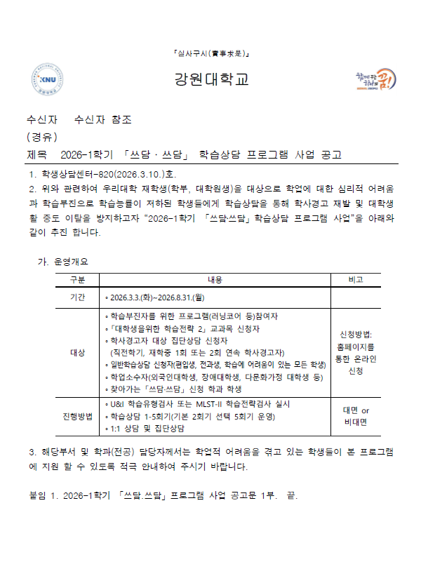 fnctId=bbs,fnctNo=840 2026-1학기 「쓰담·쓰담」 학습상담 프로그램 안내 작성일 2026.03.17 작성자 원민정 조회수 685 2026-1학기 「쓰담·쓰담」 학습상담 프로그램 안내 기간 : 2026.3.3.(화)~2026.8.31.(월) 첨부파일 1.[공고문] 2026-1학기 '쓰담.쓰담' 프로그램 사업공고.pdf 2026-1학기 「쓰담·쓰담」 학습상담 프로그램 사업 공고.pdf