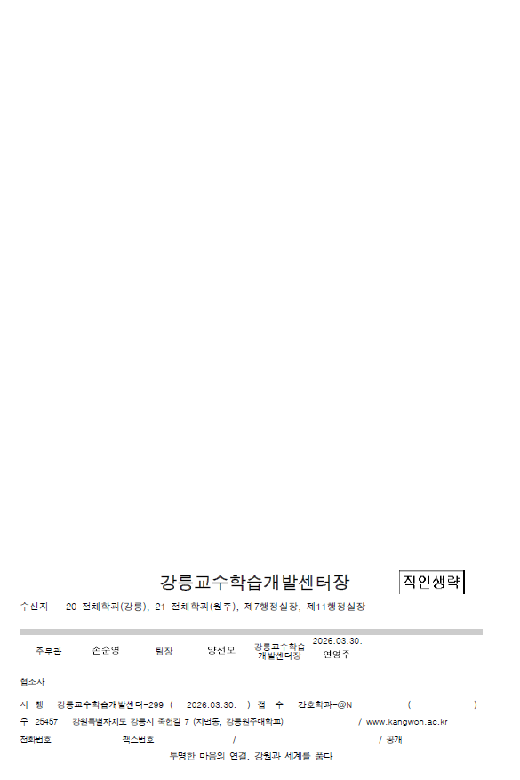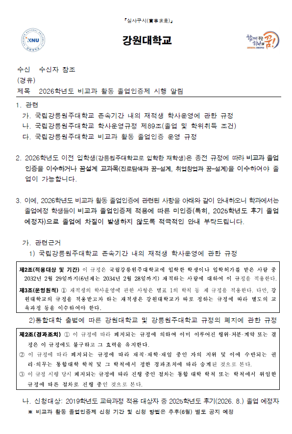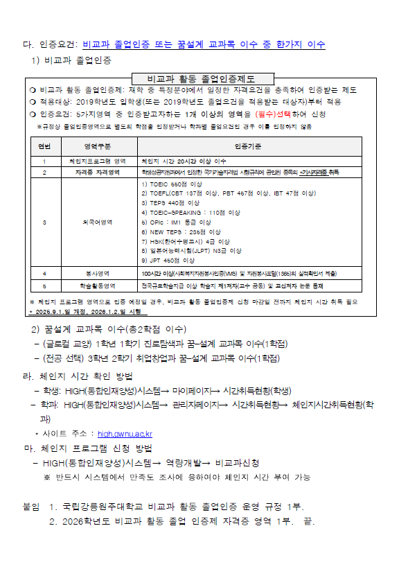 fnctId=bbs,fnctNo=840 2026학년도 비교과 활동 졸업인증제 안내드립니다. 작성일 2026.03.31 작성자 원민정 조회수 465 2026학년도 비교과 활동 졸업인증제 시행 알림 첨부파일 2026학년도 비교과 활동 졸업 인증제 자격증 영역.pdf 2026학년도 비교과 활동 졸업인증제 시행 알림.pdf 국립강릉원주대학교 비교과 활동 졸업인증 운영 규정.pdf
