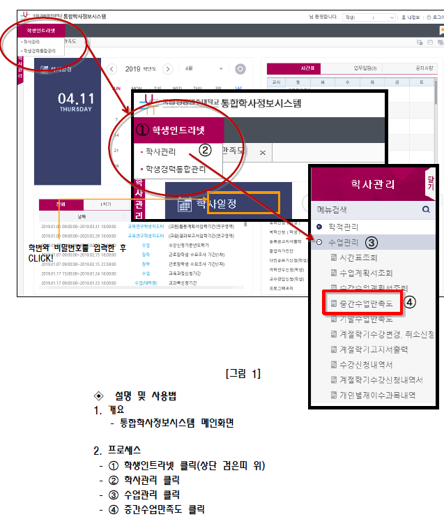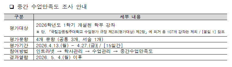 fnctId=bbs,fnctNo=840 2026학년도 1학기 중간 수업만족도(수업평가) 조사 안내 작성일 2026.04.08 작성자 원민정 조회수 280 2026학년도 1학기 중간 수업만족도(수업평가) 조사 안내 첨부파일 2026학년도 1학기 중간 수업만족도(수업평가) 조사 안내 및 협조 요청.pdf 붙임1) 2026학년도 1학기 중간 수업만족도 조사 추진 계획.pdf 붙임2) 2026-1학기 중간수업만족도 조사 안내.hwp 붙임3) 중간수업만족도 매뉴얼(학생용).pdf 붙임4) 국립강릉원주대학교 수업평가 규정.pdf