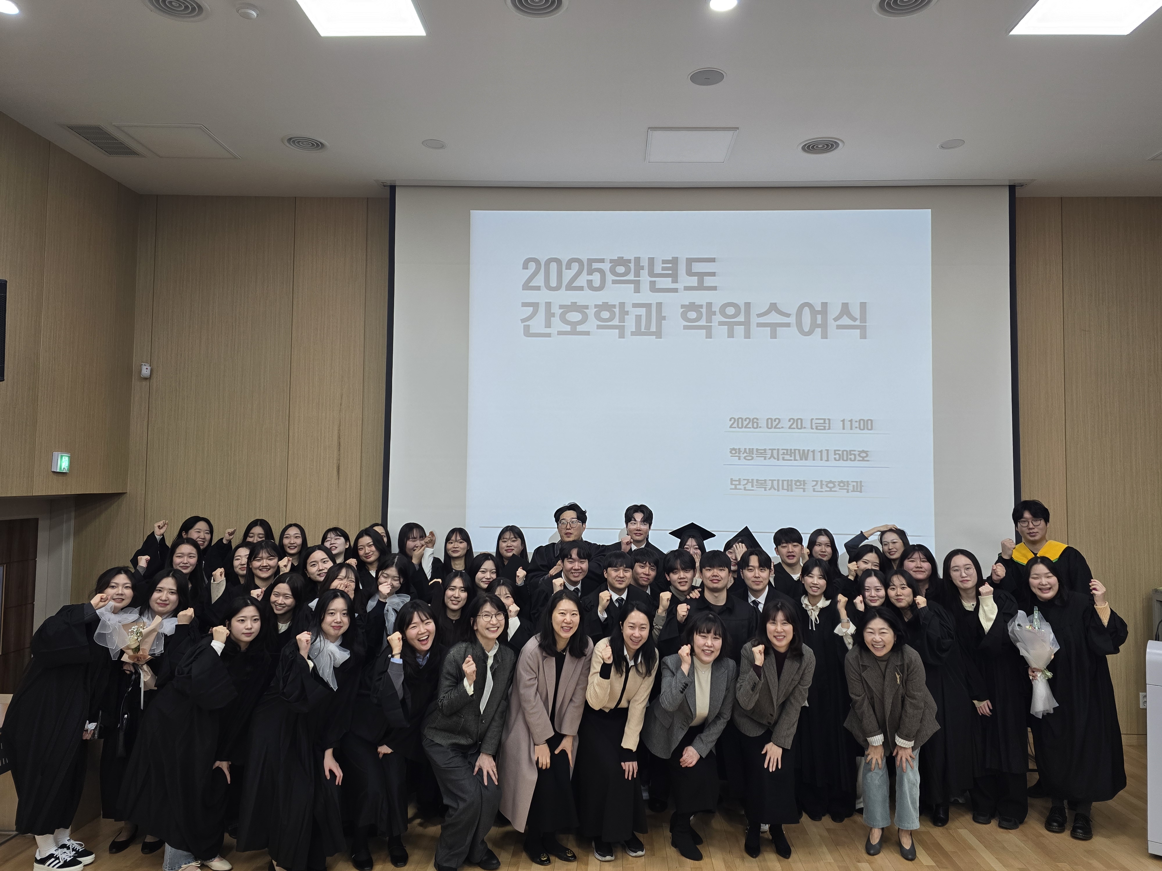 fnctId=bbs,fnctNo=839 2025학년도 전기 간호학과 학위수여식 글번호 327649 작성일 2026.02.21 작성자 원민정 조회수 1295 2025학년도 전기 간호학과 학위수여식 2026. 2. 20.(금) 11시 학생복지관(W11) 505호 첨부파일 20260220_112824.jpg 20260220_112551.jpg