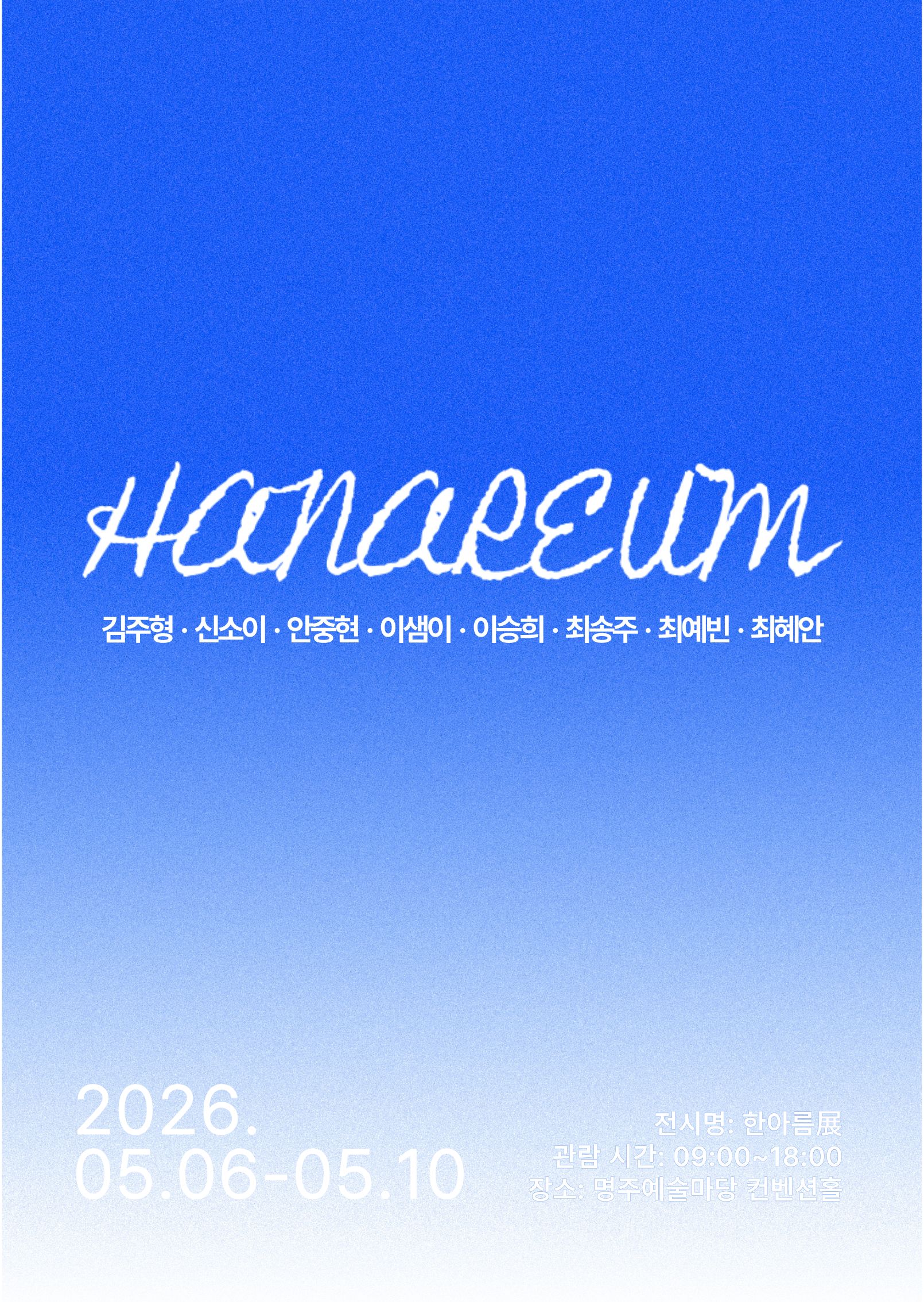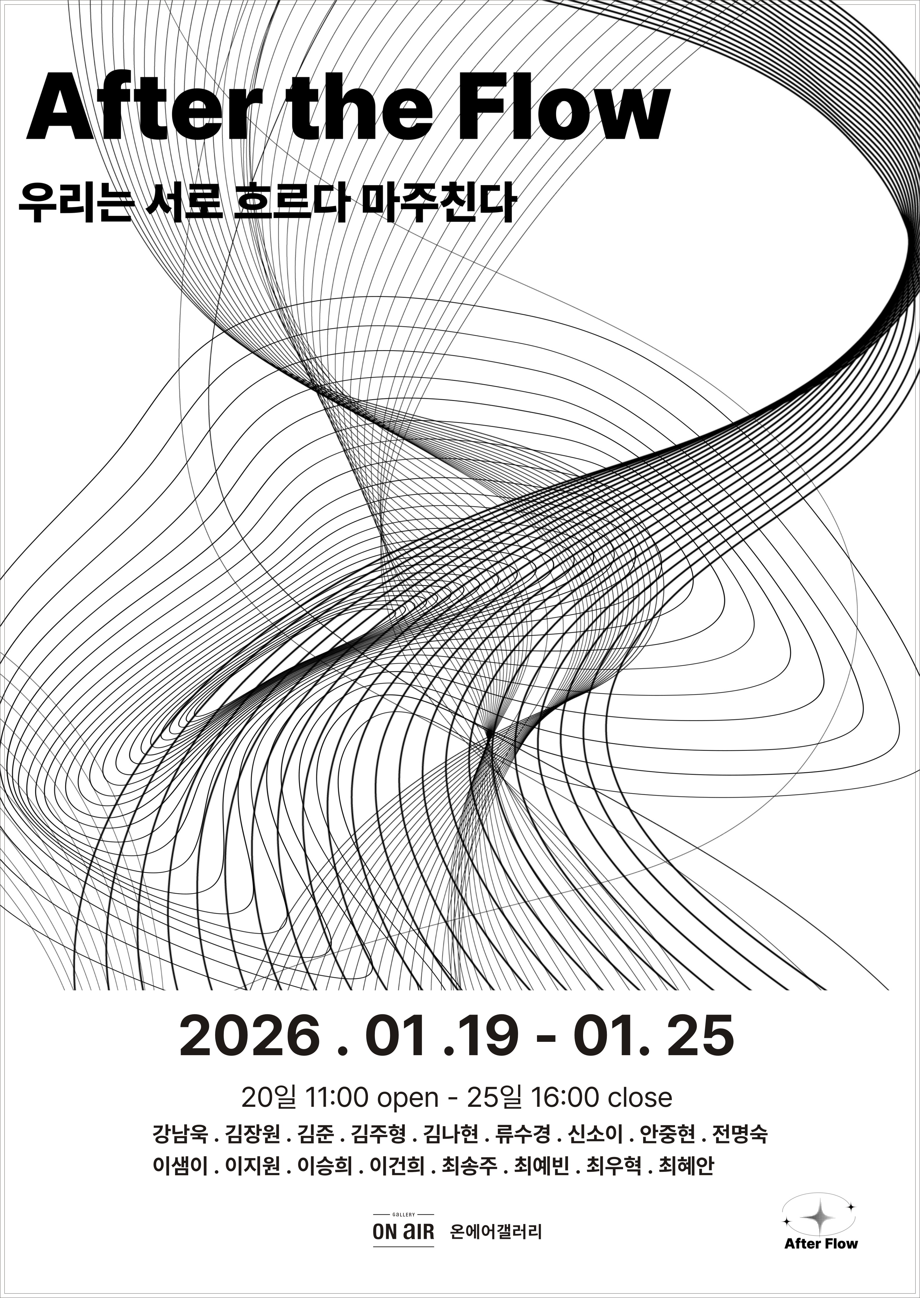 [학과 전시]2026 조형예술·디자인학과 단체전 After the Flow 우리는 서로 흐르다 마주친다 -온에어갤러리전시기간: 2026.01.19-01.25 (오픈 2026.01.20)장소: 온에어갤러리(서울 서대문구 연희동 51-91)참여작가강남욱 김장원 김준 김주형 김나현 류수경 신소이 안중2026.02.05 -