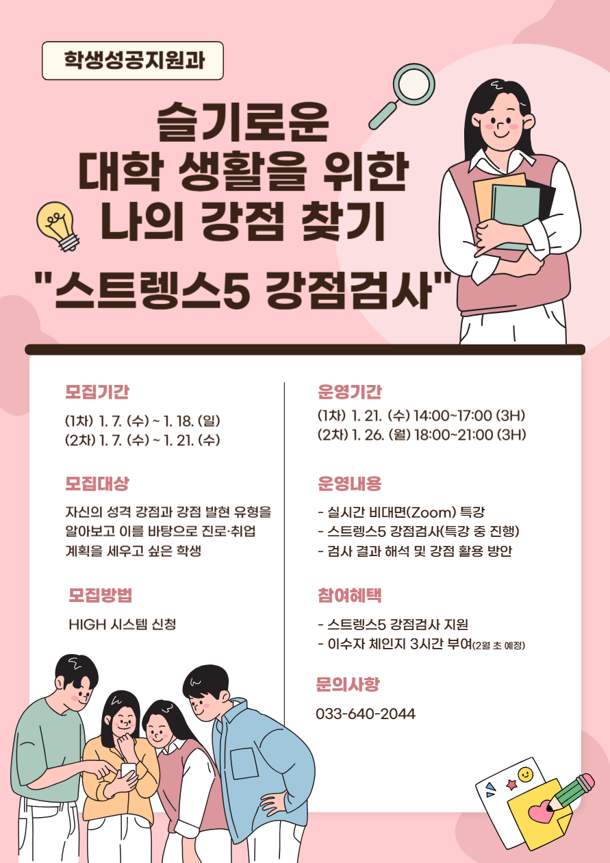 fnctId=bbs,fnctNo=1046 [학생성공지원과] 슬기로운 대학 생활을 위한 나의 강점 찾기(스트렝스5 강점검사) 작성일 2026.01.07 작성자 학생성공지원과 조회수 1357 첨부파일 첨부파일이(가) 없습니다.