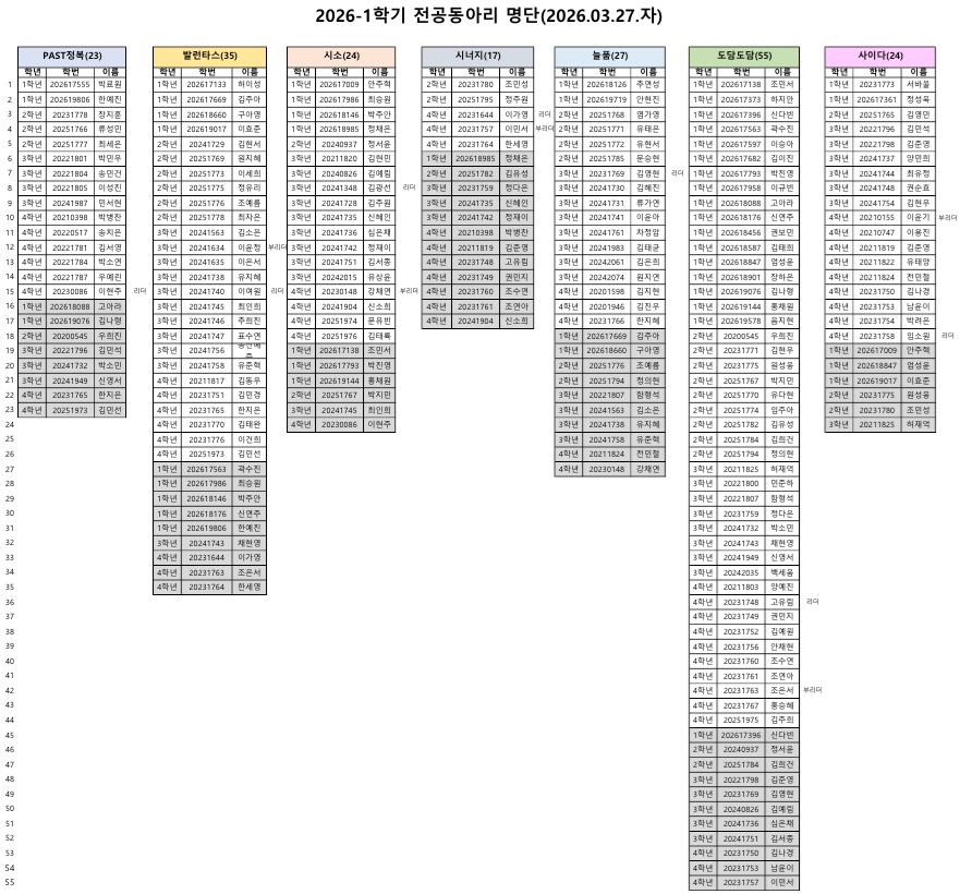 fnctId=bbs,fnctNo=852 2026학년도 사회복지학과 1인1동아리제(전공동아리) 배정 안내 작성일 2026.04.06 작성자 박아름 조회수 361 ※ 기간 내 신청하지 않은 학생은 임의배정. ※ 추가 동아리 신청한 학생은 하단에 음영으로 표기. 첨부파일 첨부파일이(가) 없습니다.