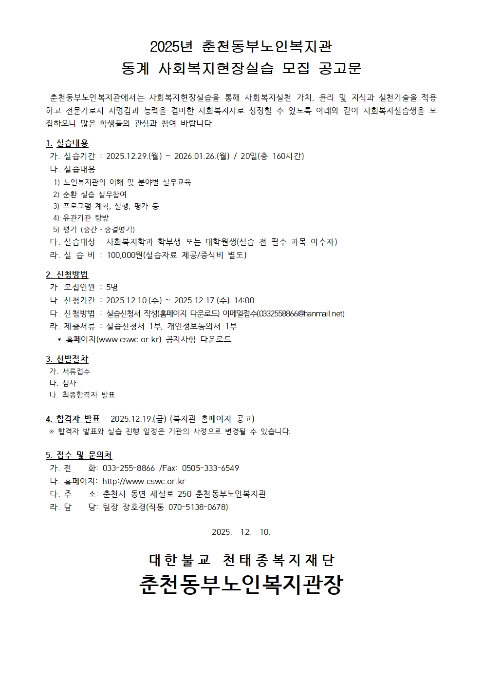 fnctId=bbs,fnctNo=849 [2026-동계] 춘천동부노인복지관 동계 실습생 모집 안내(~12.17.) 작성일 2025.12.15 작성자 박아름 조회수 1350 첨부파일 붙임1) 공고문.hwp 붙임2) 신청서.hwp